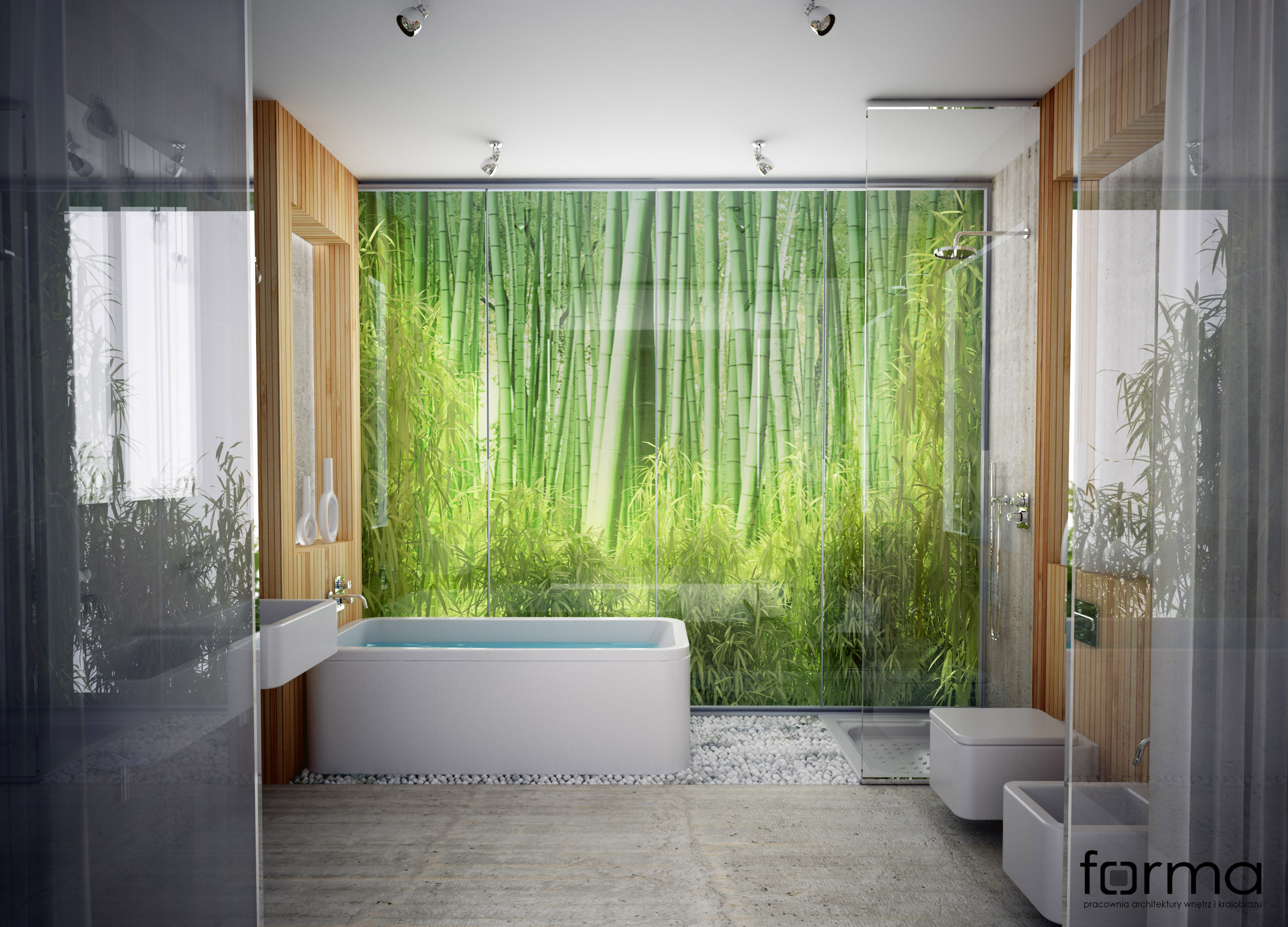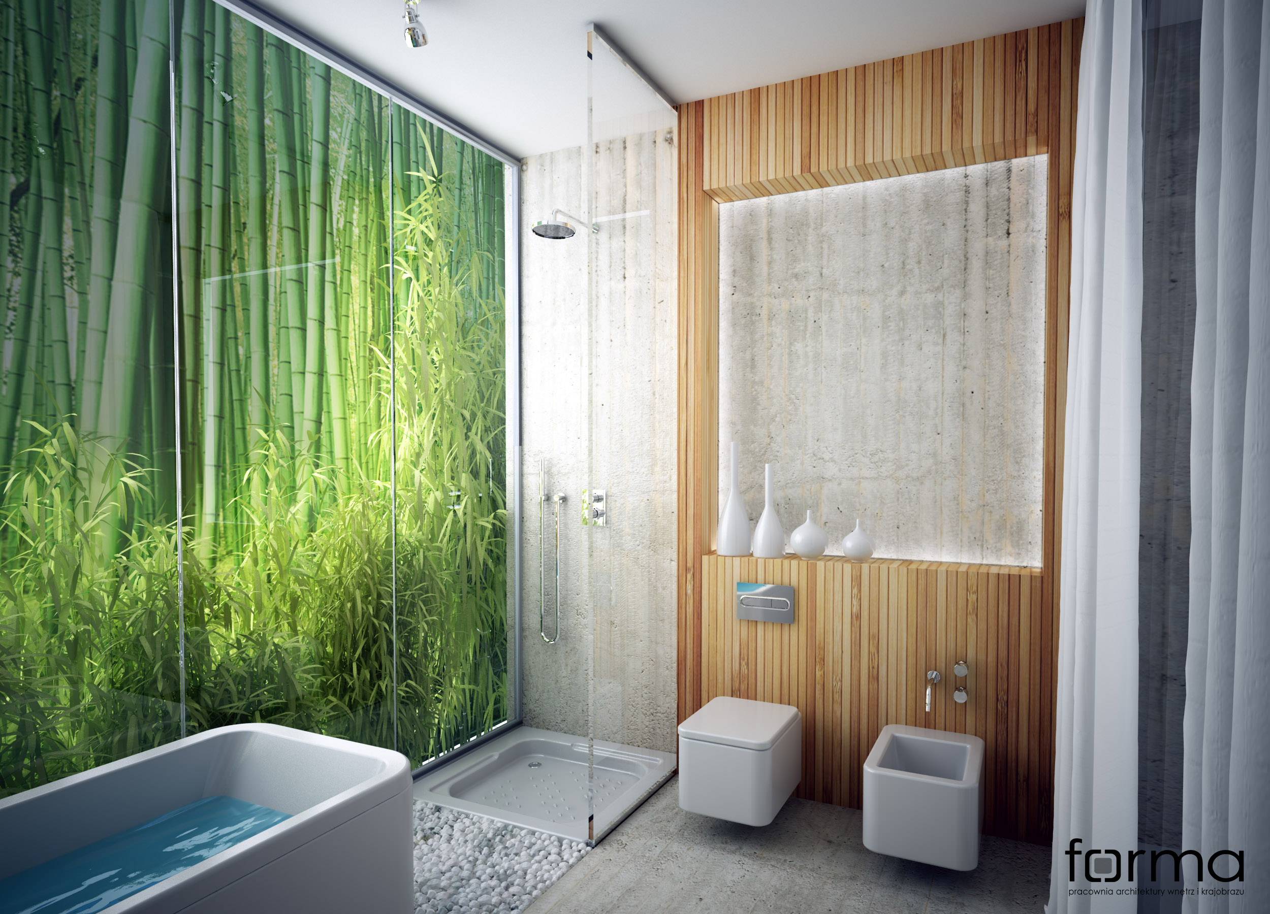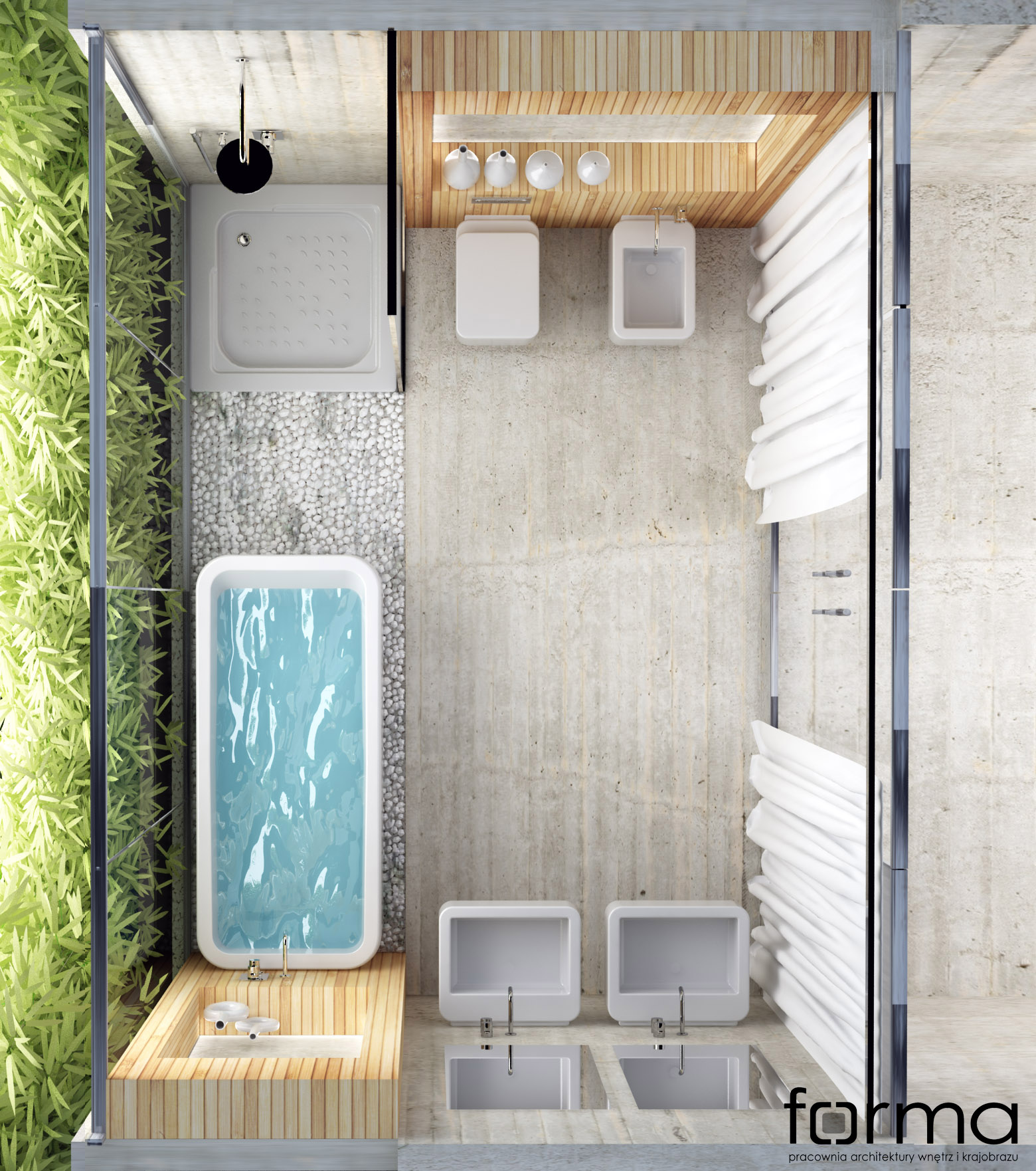 Łazienka w której dominują geometryczne formy przełamane zielenią. Faktura betonu i drewna w połączeniu z zieloną ścianą sprawiają, że wnętrze jest miejscem idealnym do odpoczynku i relaksu.