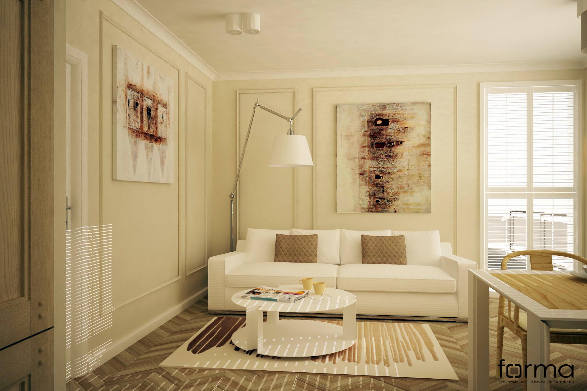 Przytulne wnętrze w ciepłej kolorystyce w którym klasyka łączy się z nowoczesnością . Niebanalny efekt uzyskany został dzięki zastosowaniu oryginalnych dodatków.