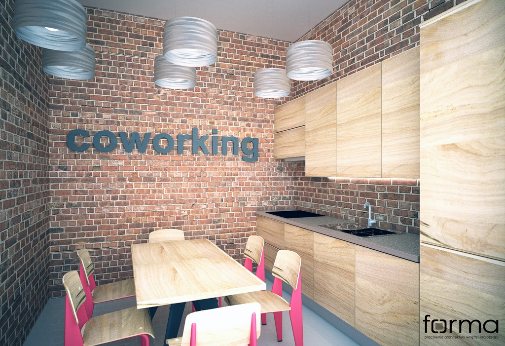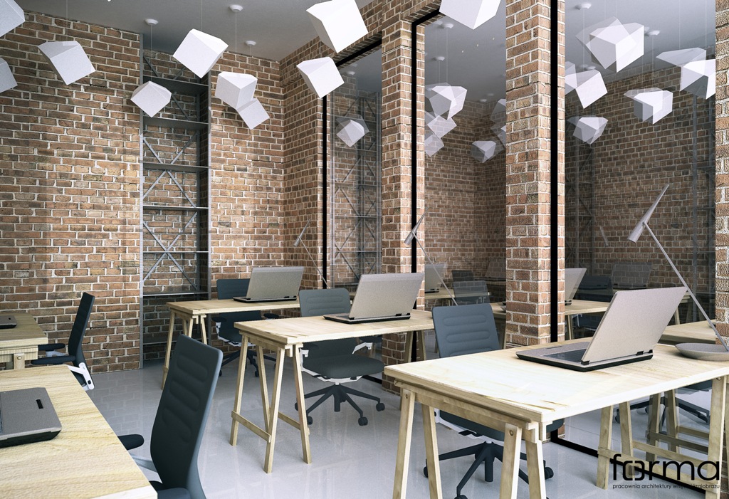 Przestrzeń do pracy w charakterze industrialnym w której główną role odgrywają cegła i drewno w połączeniu z oryginalną formą oświetlenia.