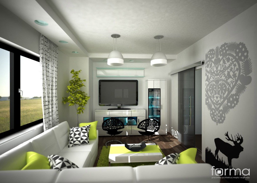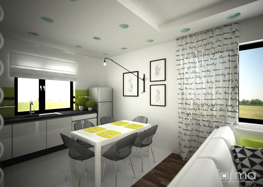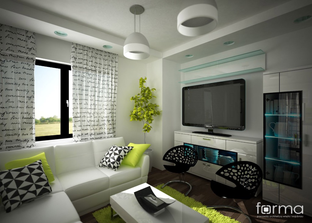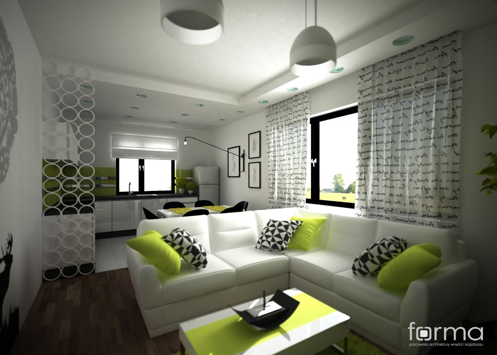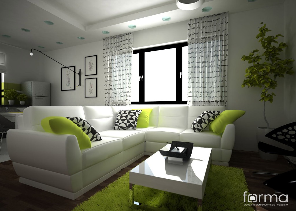 Salon połączony z aneksem kuchennym dla dwojga młodych ludzi. Subtelna biel połączona z akcentami w kolorze czerni i limonki tworzy radosne, świeże i energetyzujące wnętrze.