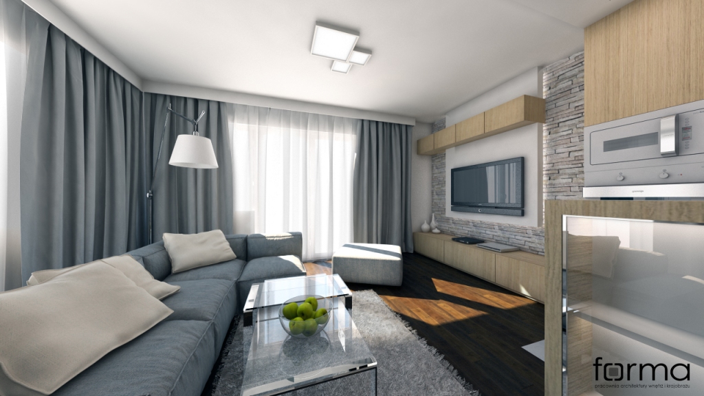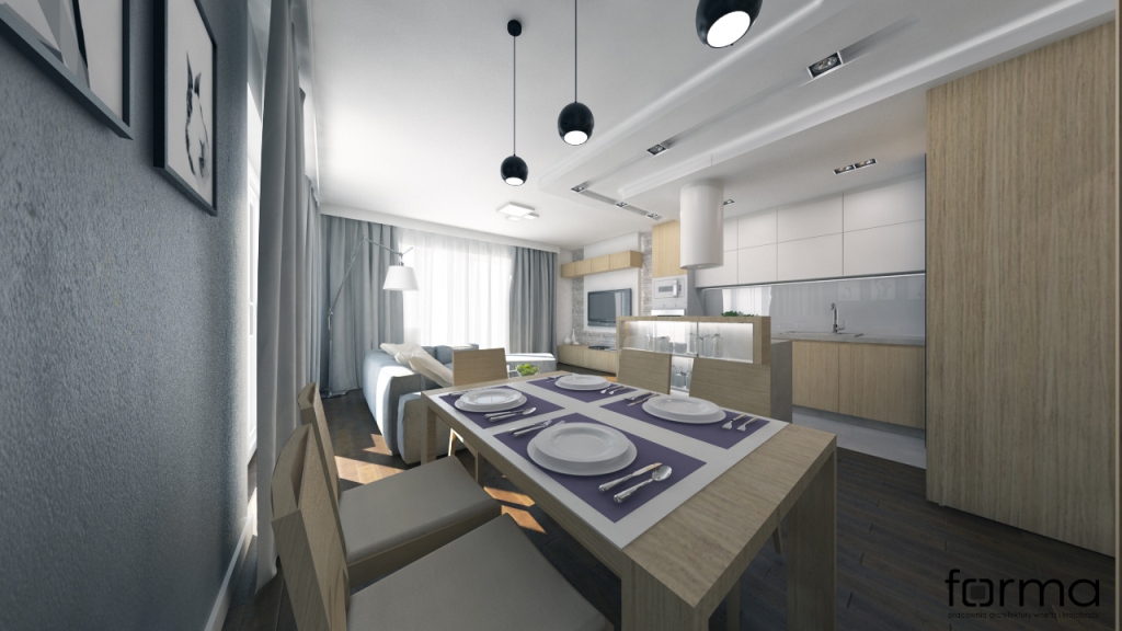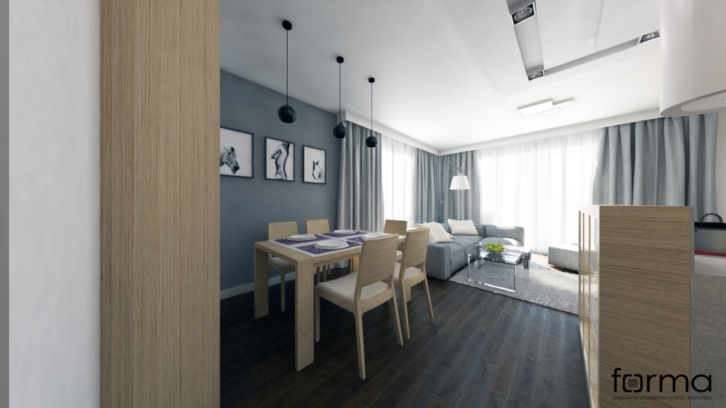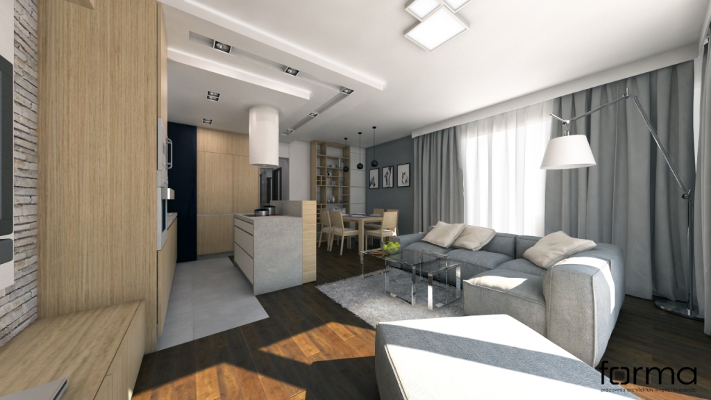 Nowoczesne wnętrze z widocznym podziałem funkcji. Dominują w nim odcienie brązu i szarości.