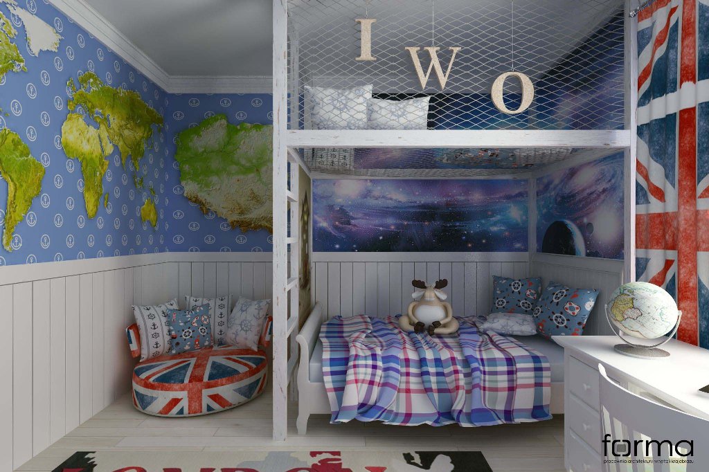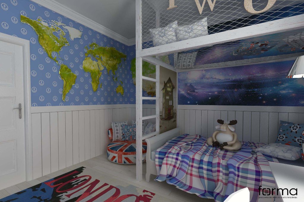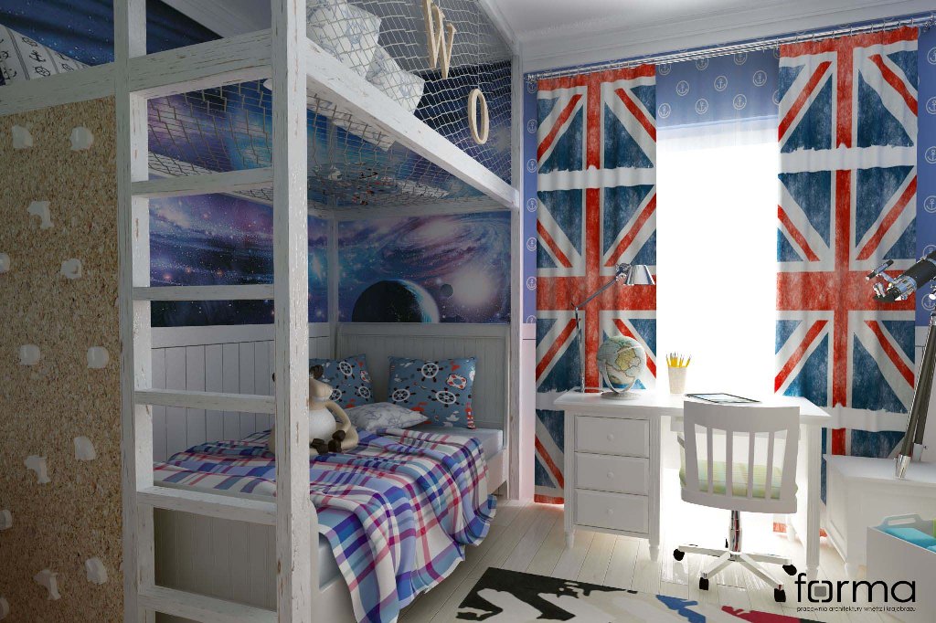 Skandynawski wystrój wzbogacony o klasyczne meble oraz elementy dekoracyjne w odcieniach błękitu i czerwieni. Pełna energii przestrzeń idealna dla małego odkrywcy.