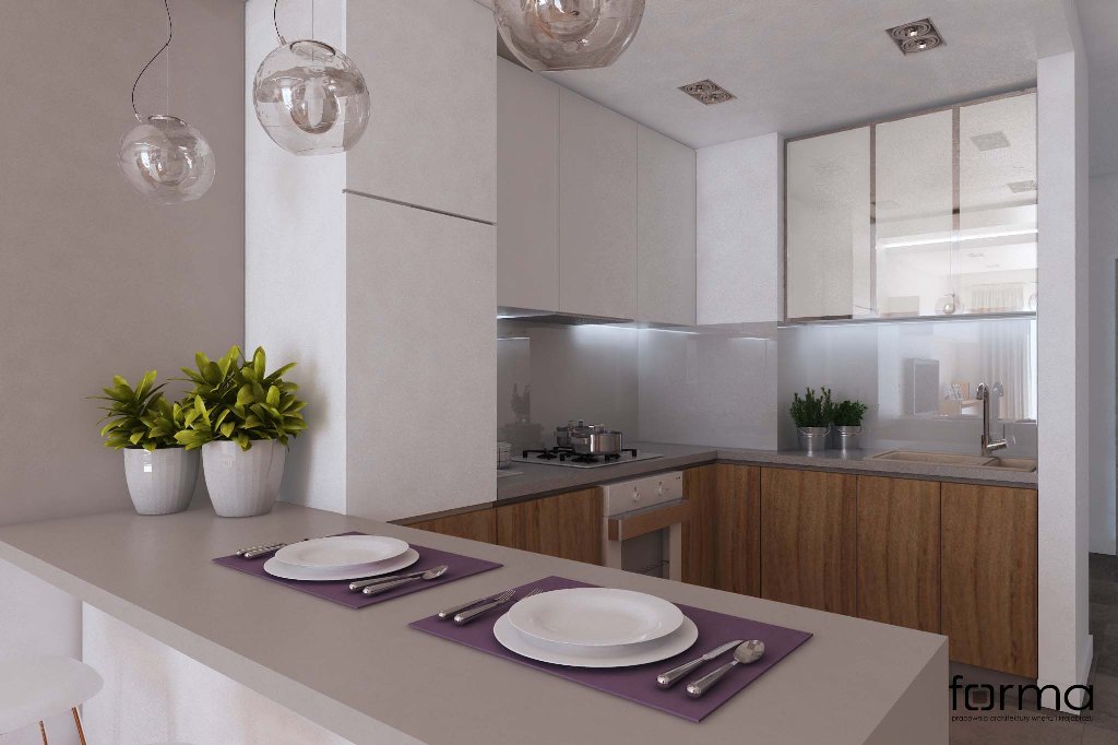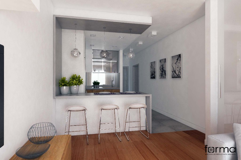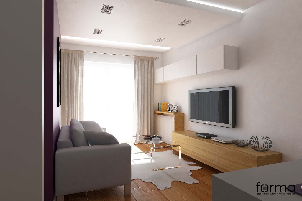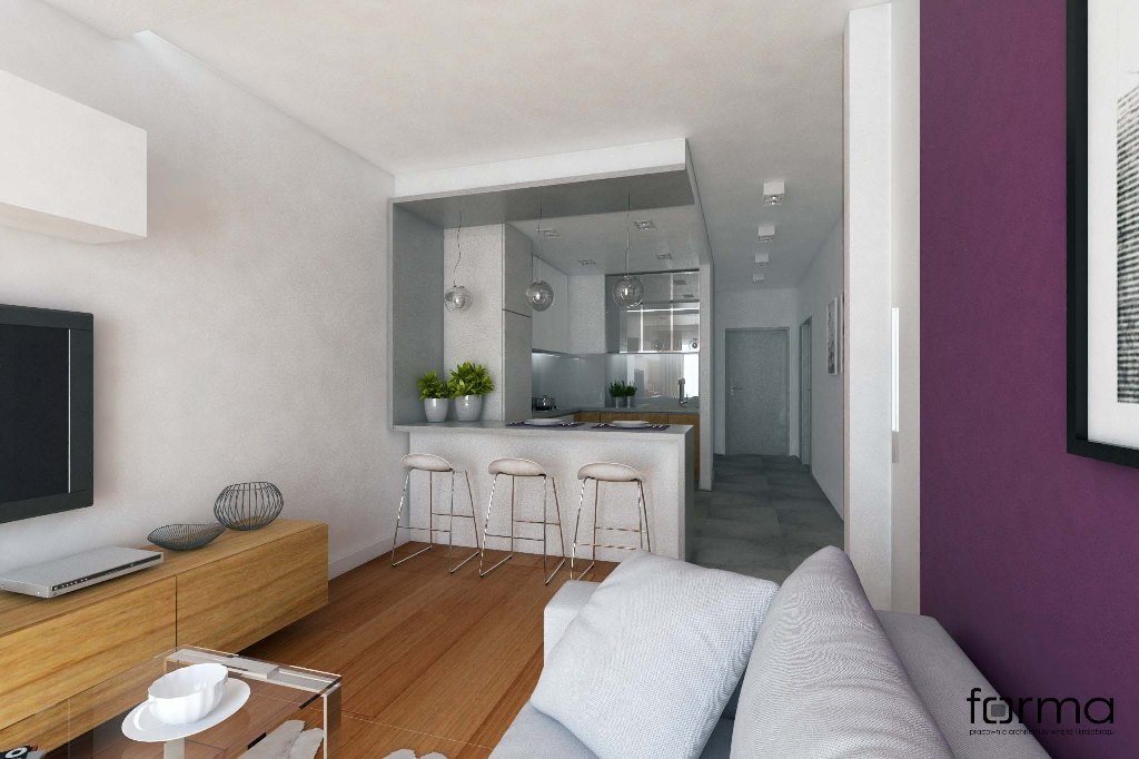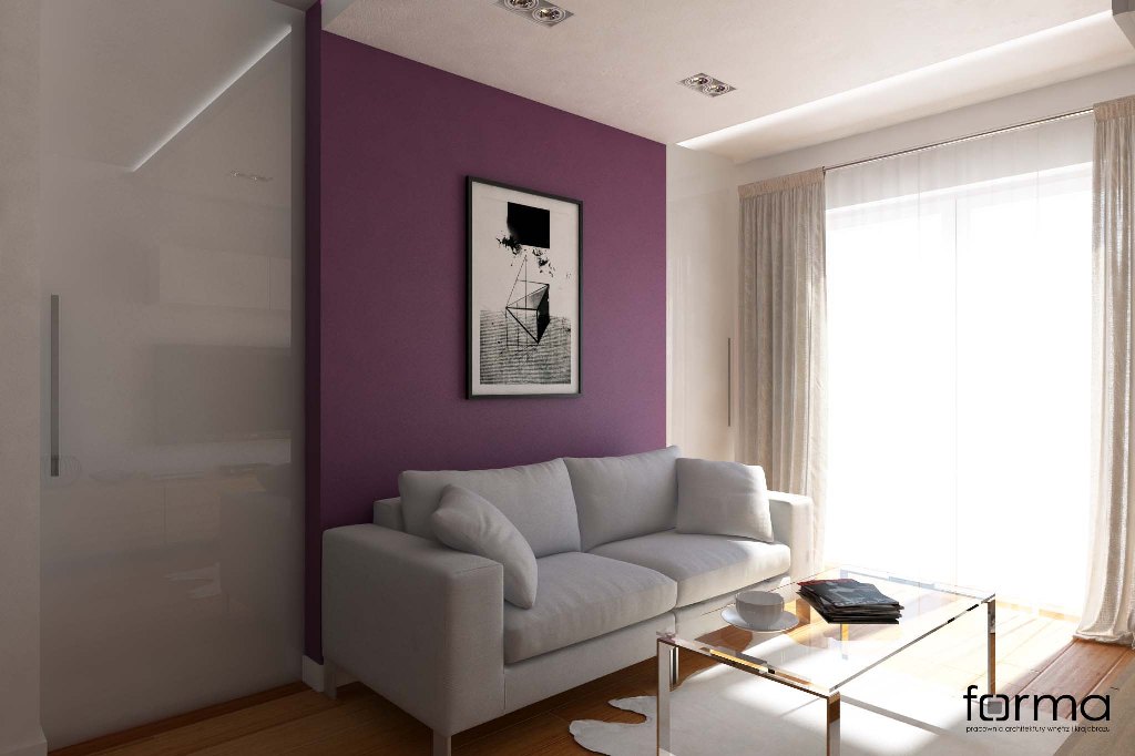 Nowoczesne wnętrze w którym dominują proste formy. Jasne kolory w połączeniu z drewnianą podłogą oraz odważnym akcentem kolorystycznym sprawiają, że przestrzeń jest miejscem idealnym do odpoczynku, relaksu, a także pracy.