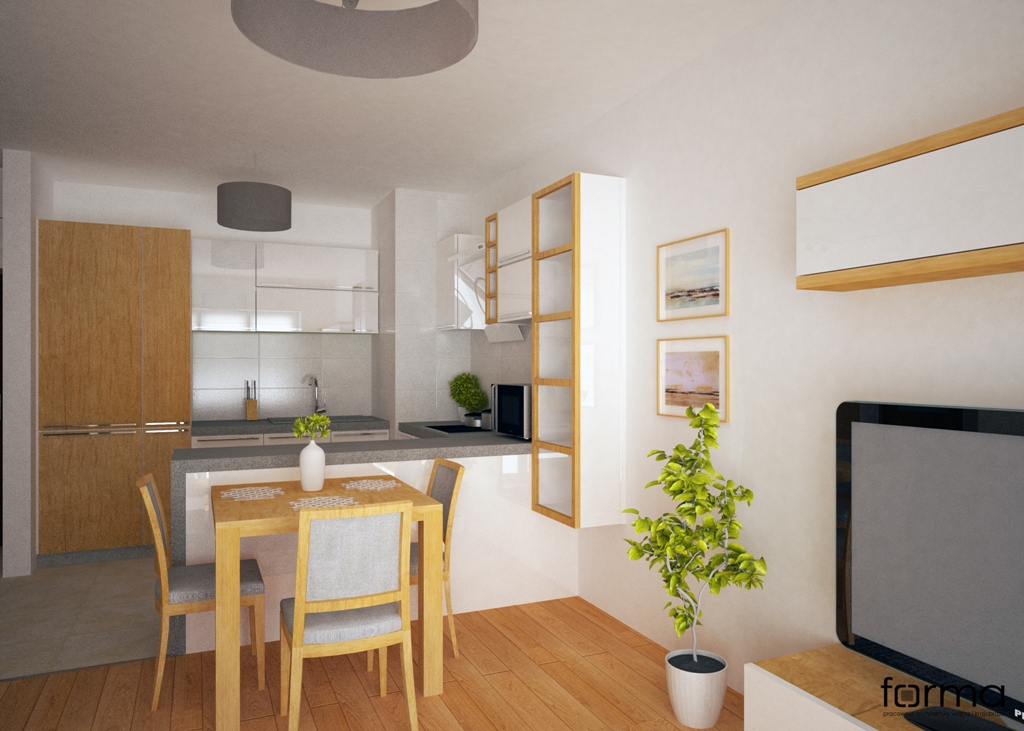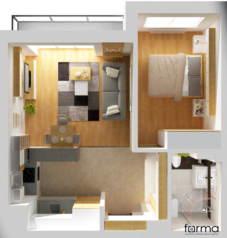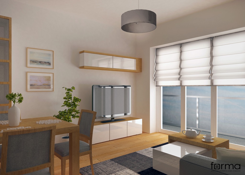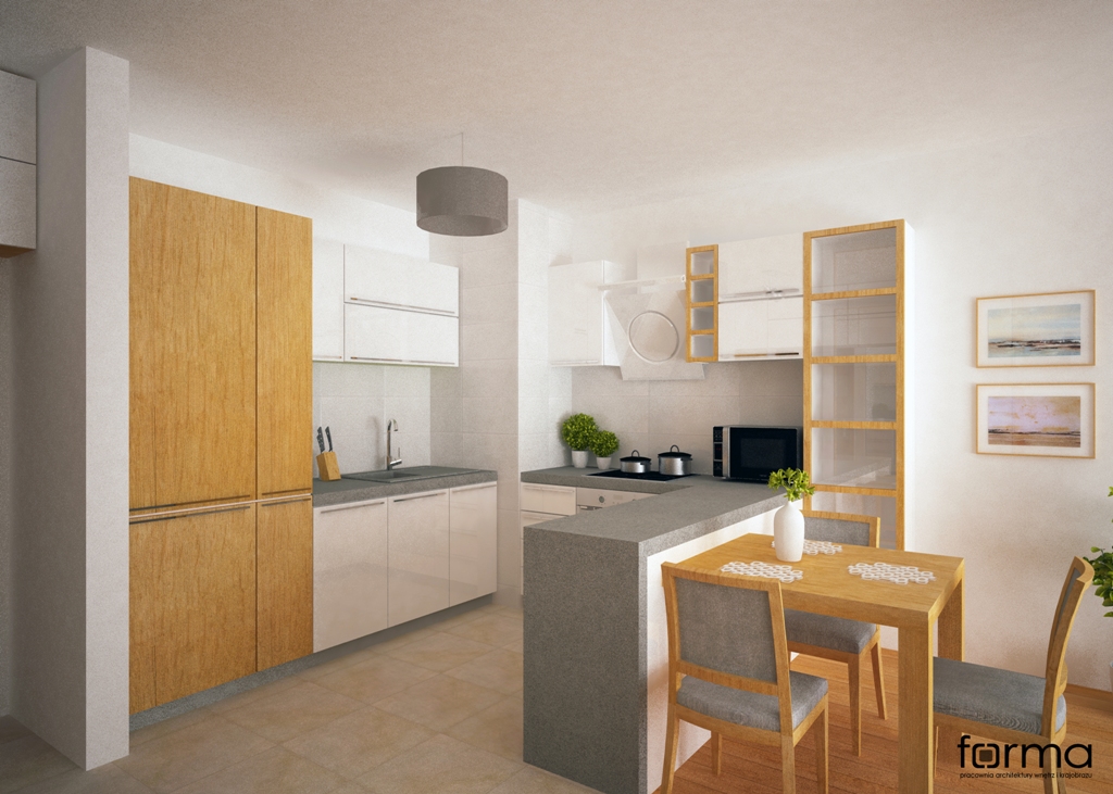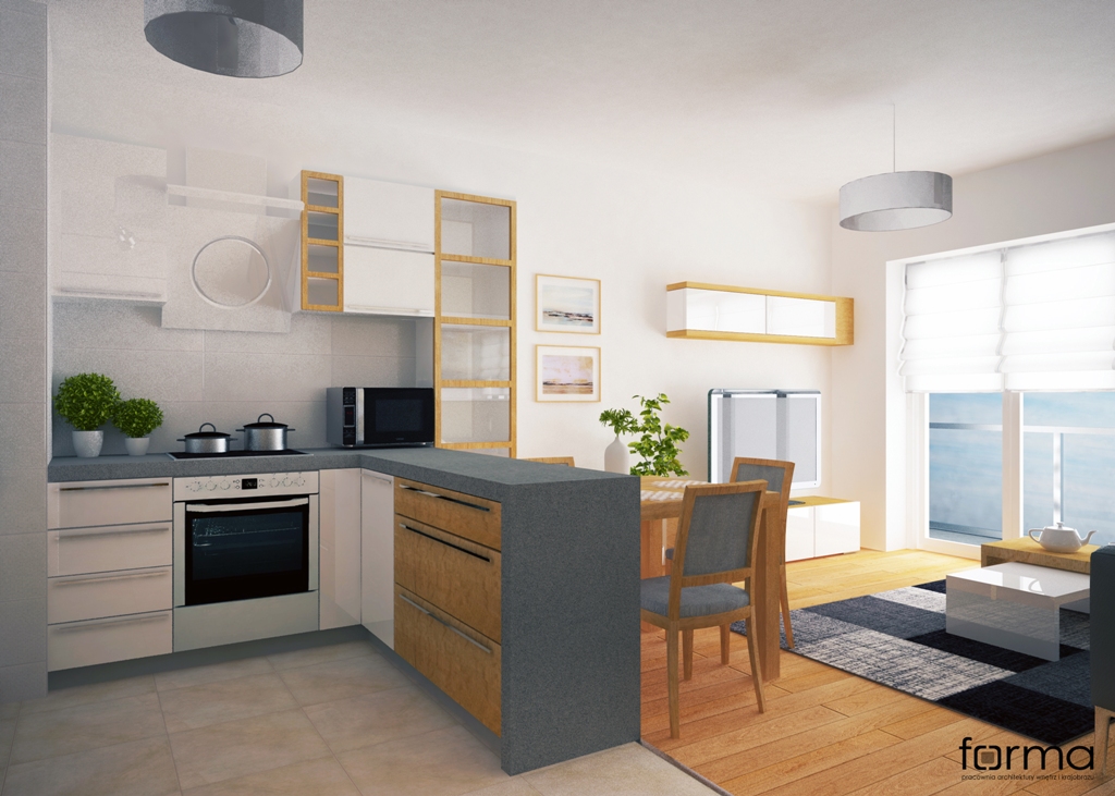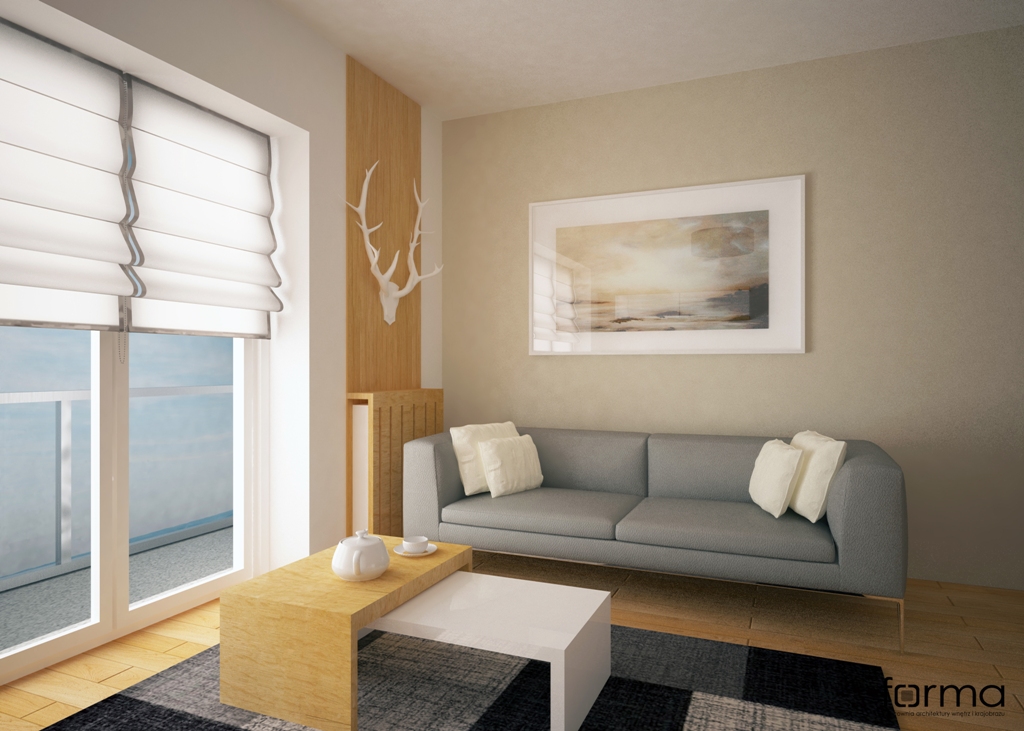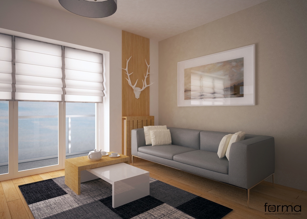 Prosta i funkcjonalna przestrzeń w stonowanej kolorystyce wzbogacona oryginalnymi dodatkami.