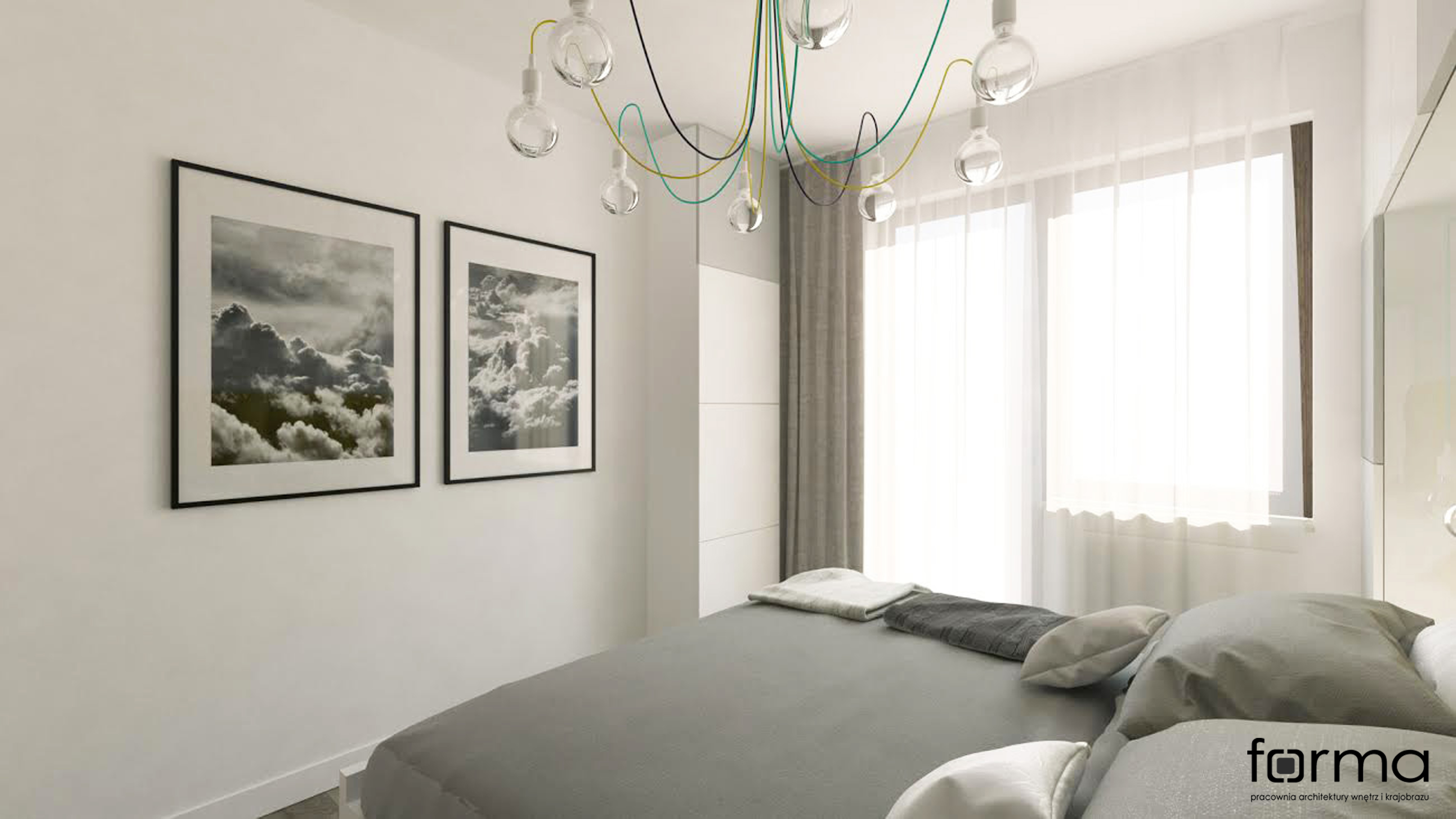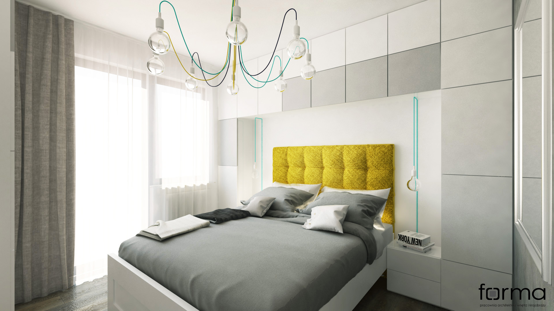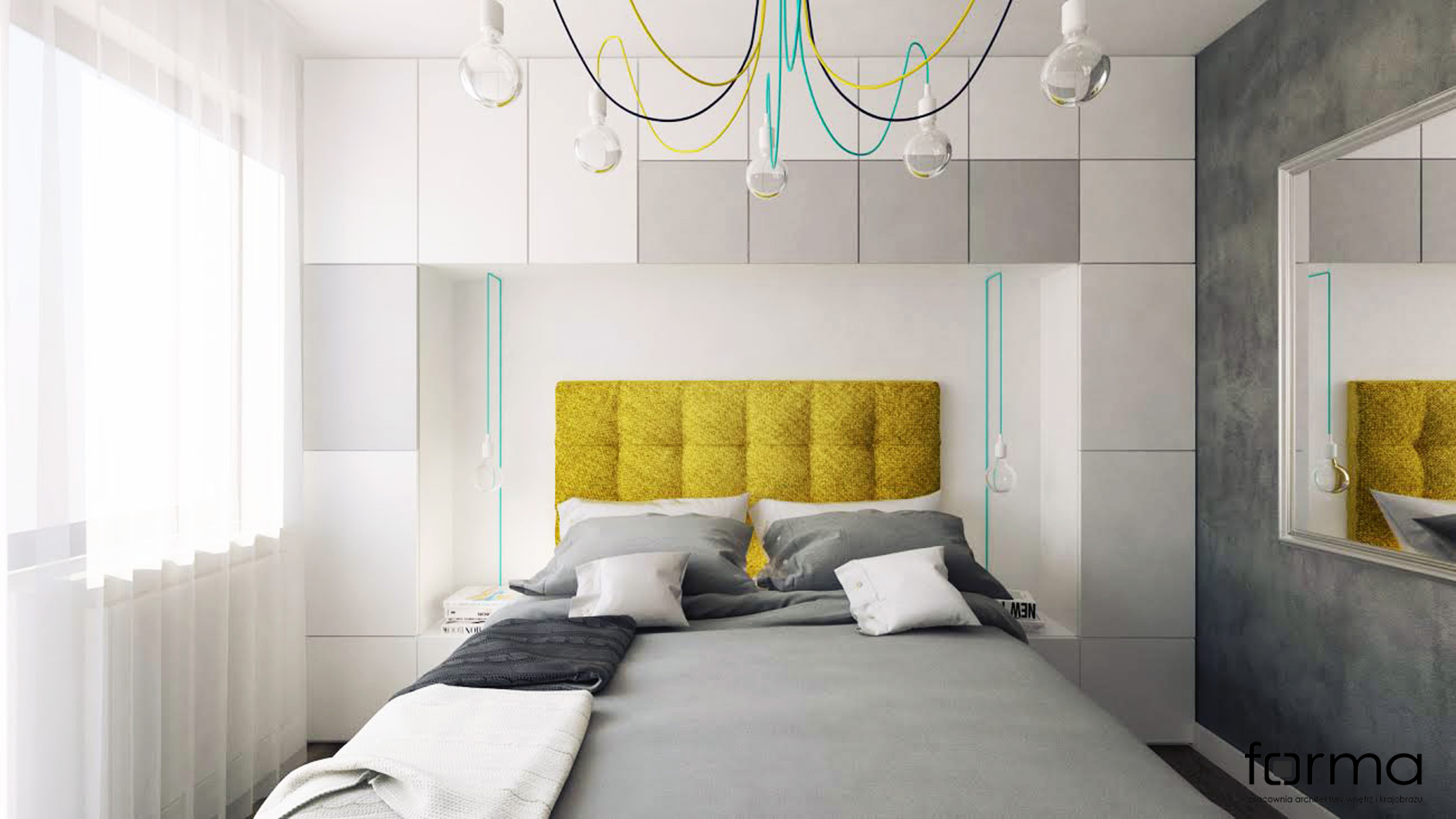 Nowoczesne wnętrze z odważnymi akcentami kolorystycznymi. Prosta forma mebli połączona została z surowym betonem oraz ciekawymi dodatkami.